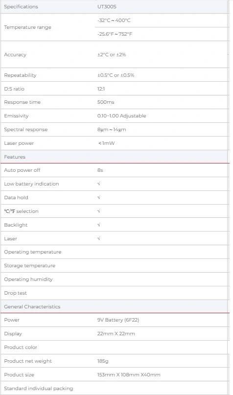 ● Temperature range: -32℃~400℃ (UT300S)