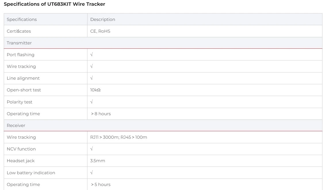 The UT683KIT is an intelligent wire tracker which consists of the transmitter and receiver, this kit is designed with strong anti-interference ability. The receiver can quickly and accurately locate the target cable. This kit can automatically identify open, short, polarity, and quickly distinguish cable failure.